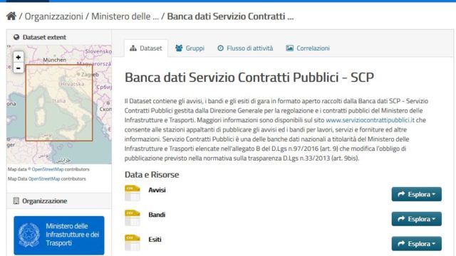 Come annunciato dal MIT il 28 giugno è possibile accedere alla piattaforma degli Opendata del MIT che ospita anche il Dataset relativo agli avvisi, i bandi e gli esiti di gara per lavori, servizi e forniture ed altre informazioni, comprensivo di file relativo ai metadati “machine readable”, raccolti dalla Banca dati Servizio Contratti Pubblici, gestita dalla Direzione Generale per la regolazione e i contratti pubblici del MIT.