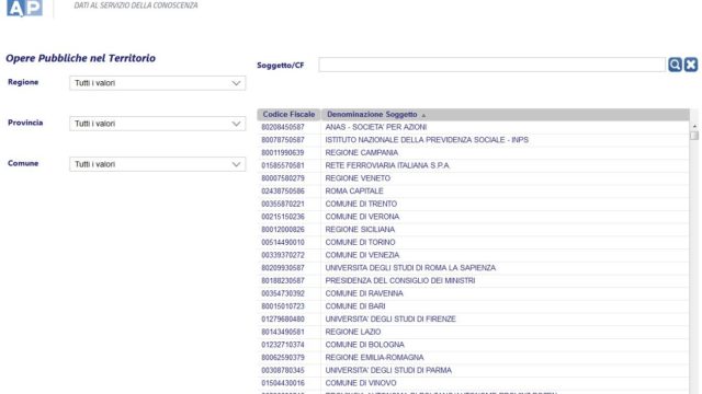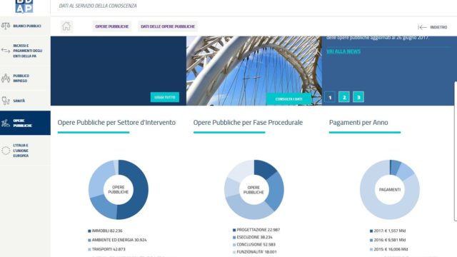 Nell’ambito del BDAP, (OpenBDAP) quello concernente le Opere Pubbliche ha un ambito di rilevazione costituito da quelle in corso al 21 Febbraio 2012. Le informazioni riguardano l’intero ciclo di vita delle opere, dalla progettazione alla realizzazione relativamente anche ad aspetti finanziari e procedurali. Al 30 Aprile 2017 sono presenti i dati di circa 170mila opere. E’ possibile effettuare la ricerca in base a criteri territoriali per Regione, Provincia e Comune o direttamente per Amministrazione o suo Codice Fiscale. Le PA trasmittenti e detentrici originarie del dato hanno a disposizione un collegamento ipertestuale personalizzato sulla base del proprio CF che possono rendere disponibile sul proprio sito web in sostituzione dei dati che prima erano obbligati a rendere pubblici singolarmente.