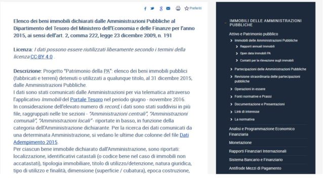 La Banca in questione contiene i dati, in formato elaborabile, comunicati dalle Amministrazioni pubbliche al Dipartimento del Tesoro del Ministero dell’Economia e delle Finanze, sui beni immobili pubblici (fabbricati e terreni) da esse detenuti o utilizzati a qualsiasi titolo, al 31 dicembre 2015. Le informazioni sono state suddivise in più file, raggruppati nelle tre sezioni – “Amministrazioni centrali”, “Amministrazioni comunali”, “Amministrazioni locali”. Per ciascun bene immobile dichiarato dall’Amministrazione, sono riportati: localizzazione, identificativi catastali (o codice bene nel caso di immobili non accatastati) o comunque stato accatastamento, tipologia immobiliare, titolo di utilizzo/detenzione, natura giuridica, tipo di utilizzo e finalità, dimensione (superficie / cubatura), epoca costruzione, vincolo culturale paesaggistico, appartenenza a un compendio, Amministrazione proprietaria (se diversa da quella dichiarante), Comproprietà Edificabilità (Terreni), informazioni su eventuale locazione con il dettaglio della superficie locata e del canone percepito.