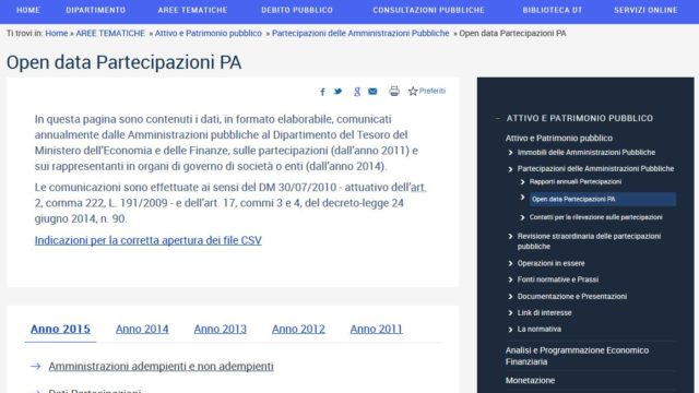 Come annunciato dal MEF il 23 giugno scorso, grazie ad un protocollo di intesa sottoscritto dalla Corte dei Conti con quest’ultimo a maggio 2016 che ha dato luogo all’unificazione delle rispettive banche dati, il sistema che gestisce l’accesso dell’archivio dei dati relativi alle partecipate è detenuto, sviluppato e gestito solo dal Dipartimento del Tesoro. Il protocollo stabilisce che quest’ultimo raccolga attraverso la propria banca dati tutte le informazioni necessarie non solo alla rilevazione delle partecipazioni e dei rappresentanti delle Amministrazioni negli organi di governo di società ed enti, ma anche alle attività di controllo e referto della Corte dei conti. Le informazioni riguardano tutti gli immobili nonché le partecipazioni detenute dalle PA al 31 dicembre 2015. I rapporti annuali erano già disponibili dal 2011, all’avvio dell’attività di rilevazione del Patrimonio, e per le partecipazioni i dati sono pubblicati in formato aperto già dall’anno 2011, ampliati poi, dal 2014, con, in aggiunta, le informazioni sui rappresentanti negli organi di governo di società o enti. I dati riguardano le comunicazioni effettuate dalle PA sul Portale Immobili e Partecipazioni Per quelli riferiti agli anni successivi, al momento il sistema sembra fermo al 23 marzo 2017 (era stato già preannunciato il 27 luglio e il 17 ottobre 2016 quando si era segnalato che l’applicativo Partecipazioni sarebbe stato aperto per le comunicazioni sulla revisione straordinaria, ai sensi dell’art. 24 del D.lgs. 175/2016, a seguito dell’approvazione dello schema del decreto correttivo approvato definitivamente il 9 giugno dal Consiglio dei Ministri n. 33 poi pubblicato in G.U. n.147 del 26-06-2017 con il D.lgs. 16 giugno 2017, n. 100 ed entrato in vigore il giorno successivo).