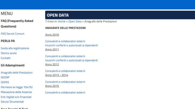 Gli unici open data disponibili su PerlaPA sono quelli relativi ai Consulenti e collaboratori esterni del 2015, quelli dei dipendenti sono fermi al 2010, i Dati Assenze puntano, al momento, ad una pagina di errore.