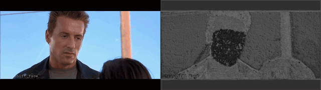 Figura 2: in alto il frame di un video deepfake e la corrispondente fingerprint, in cui si nota una zona più scura sul volto. In basso l’estrazione delle heatmap in corrispondenza dei volti presenti nel video. L’analisi mostra chiaramente la manipolazione del volto di Arnold Schwarzenegger, che è stato modificato con quello di Stallone nel film Terminator (https://www.youtube.com/watch?v=Gz0QZP2RKWA).
