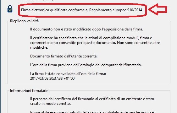 Nel secondo caso si tratta invece di firma apposta mediante certificato rinnovato successivamente al 1° luglio 2016 e, pertanto, avente lunghezza di 2048 bit. In tal caso, Acrobat Reader attesta che la firma elettronica qualificata è conforme al Regolamento europeo 910/2014: