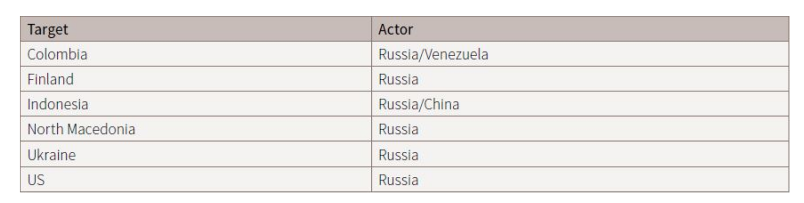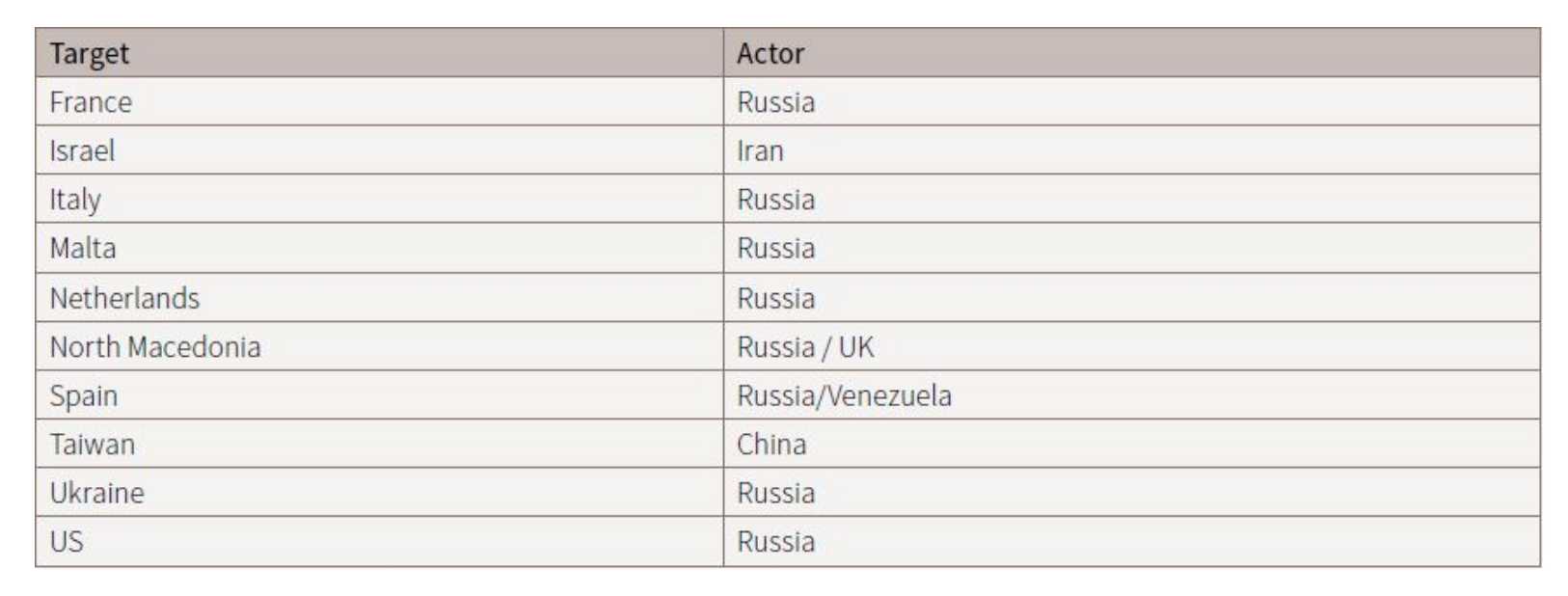 Orbene, i risultati della ricerca, evidenziano che delle 97 elezioni nazionali in paesi liberi o parzialmente liberi esaminati nel periodo compreso tra l’8 novembre 2016 e il 30 aprile 2019, ben un quinto (cioè 20 paesi) ha mostrato chiari casi di interferenza straniera (alcuni paesi hanno subito più volte tali interferenze). Nelle tabelle qui sotto, pubblicate nella ricerca dell’ASPI, vengono elencati i paesi target oggetto di interferenza (“Target”) e il relativo paese “attaccante” (“Actor”), sia tramite attacco alla infrastruttura elettorale adottata dal paese target (tabella 1), sia tramite attacco informativo volto a manipolare e/o distorcere le informazioni per alterare il consenso elettorale.