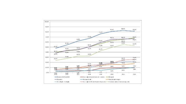 È evidente come i segmenti più in ritardo, dal punto di vista della diffusione di Internet, sono anche quelli in cui si trovano più facilmente le condizioni di marginalità nella società: età medio-alta (oltre i 45 anni), titolo di studio basso, inattivi che non hanno mai lavorato o hanno svolto lavori manuali. Anche l’evoluzione dei tassi di utilizzo di Internet è molto più lenta in segmenti di questo tipo. Per esempio, di seguito vengono mostrati gli andamenti temporali della quota di utenti di Internet in alcuni segmenti specifici della popolazione.