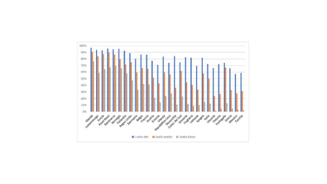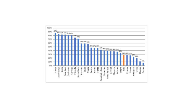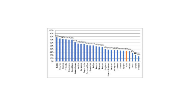 Se poi si analizza questo dato diviso per livello di istruzione, si nota che la penalizzazione di questa fascia di età in Italia deriva soprattutto dall’elevata incidenza della popolazione con il livello più basso, che mostrano un tasso di utilizzo del 12%, contro il 72% circa di coloro che hanno un livello di istruzione elevato. Questo rappresenta un ulteriore fattore di ritardo rispetto a paesi in cui la differenza di utilizzo tra livelli di istruzione, nella stessa fascia di età, è relativamente più contenuta.