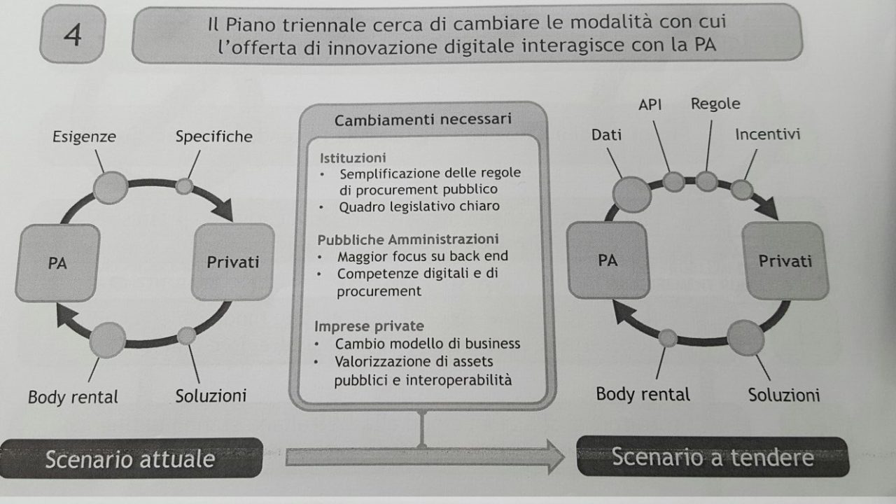 L’innovazione del processo d’acquisto, insomma, è uno dei nodi fondamentali della questione. In questo schema, viene descritto il modo in cui il piano triennale cerca di cambiare le modalità di interazione fra il lato dell’offerta di innovazione e le pubbliche amministrazioni.