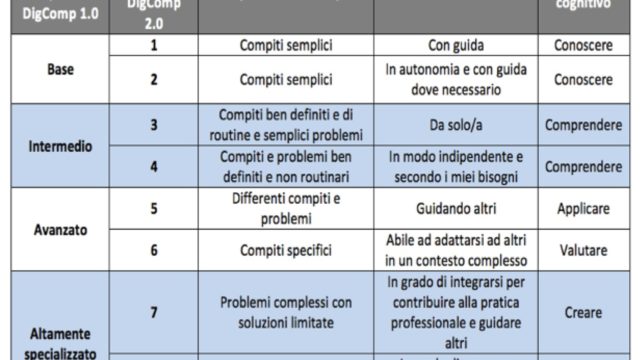L’aggiornamento alla versione 2.1 del framework DigComp[6] porta da 3 ad 8 i livelli di padronanza (per ciascuna delle 21 competenze digitali organizzate in 5 aree di competenza) finalizzati a facilitare la descrizione ed il riconoscimento della competenza digitale dei cittadini.
