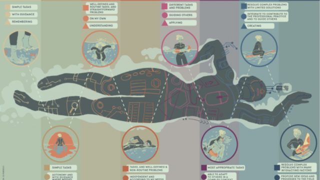 Come nuotatori iniziamo, se alle prime armi, ad immergerci nell’acqua con prudenza confrontandoci con compiti semplici, cercando una guida a cui rivolgerci, stando attenti a ricordare le indicazioni più importanti. Acquisita maggiore sicurezza, possiamo pian piano cavarcela da soli in compiti non complessi e chiedere supporto solo se lo reputiamo necessario. Siamo al livello base.