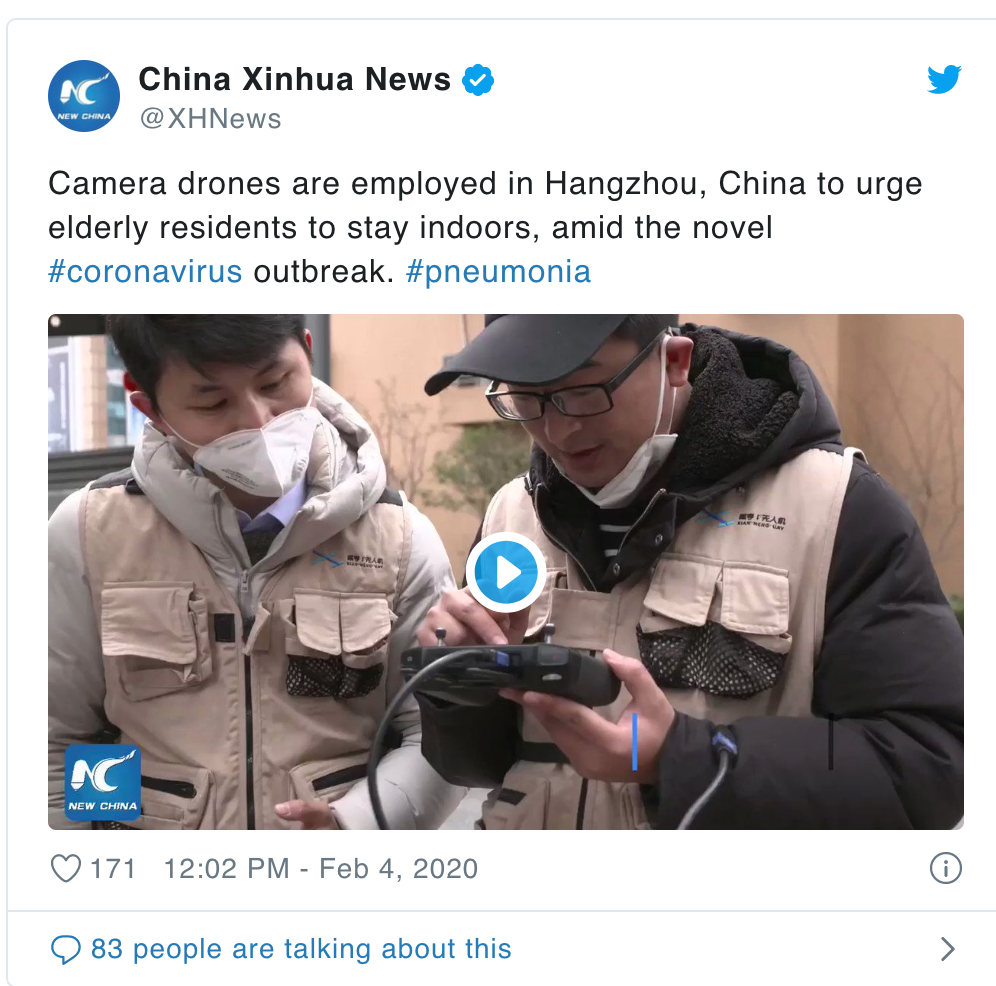 I video rilasciati dai media statali cinesi riprendono droni gestiti dalla polizia che monitorano gli spostamenti dei cittadini in pubblico, richiamandoli alle migliori precauzioni contro il virus