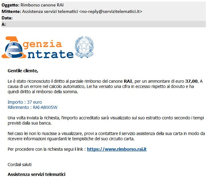 Trattasi di una campagna concernente una falsa comunicazione da parte dell’Agenzia delle Entrate, riguardante il rimborso dell’odiatissimo canone Rai.