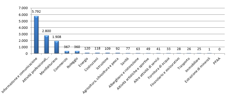 Dal punto di vista settoriale, il 78% delle start-up innovative fornisce servizi alle imprese (Fig. 2): le prime due categorie per numerosità sono i servizi di informazione e comunicazione, con 5.792 startup (dove prevalgono la produzione di software e consulenza e attività dei servizi di informazione, che da sole spiegano il 46% del totale), e le attività professionali, scientifiche e tecniche, con 2.800 startup in tutto (buona parte delle quali si occupa di Ricerca e Sviluppo, che da sola fa un ulteriore 14% del totale). Il 17% opera nei settori dell’industria in senso stretto, dalla creazione di computer e prodotti elettronici e ottici alla realizzazione di macchinari ed apparecchiature elettriche, mentre il 3,3% è attivo nel commercio.